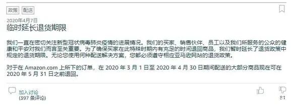 "在公告中,亚马逊声称:“我们的客户、员工和我们所服务的社区的健康和福祉对我们来说是最重要的。为了确保买家在此特殊时期内有充足的时间退回商品,我们暂时延长了退货政策中规定的退货期限。”